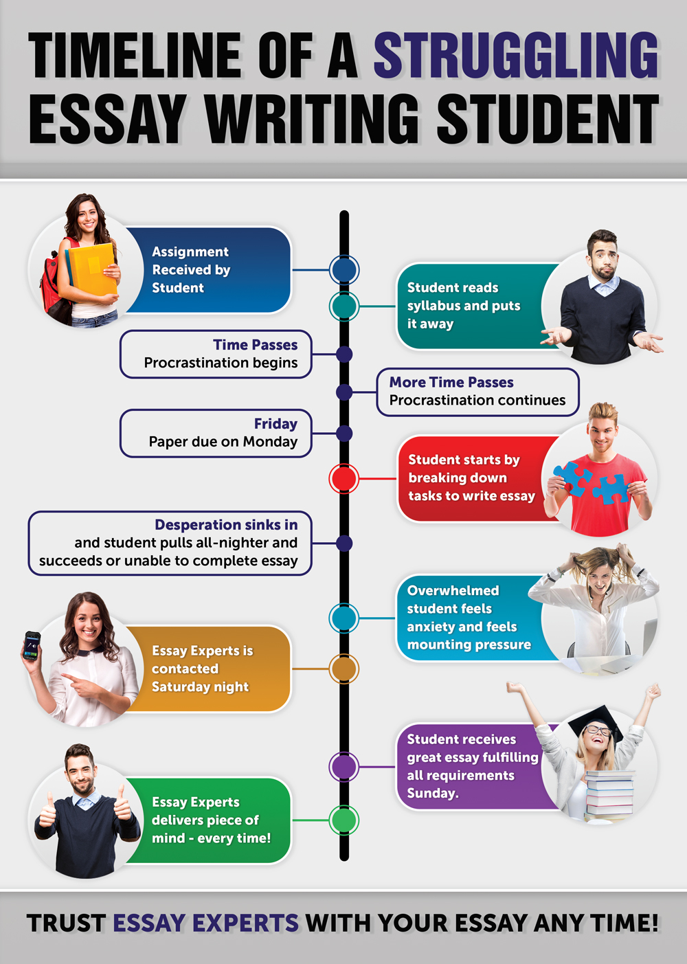 This is where we can help to make things easier for overwhelmed students. It's not uncommon for students to need some extra support. We at Essay Experts aim to bridge the gap between students and their academic essay success and we are here to help.
